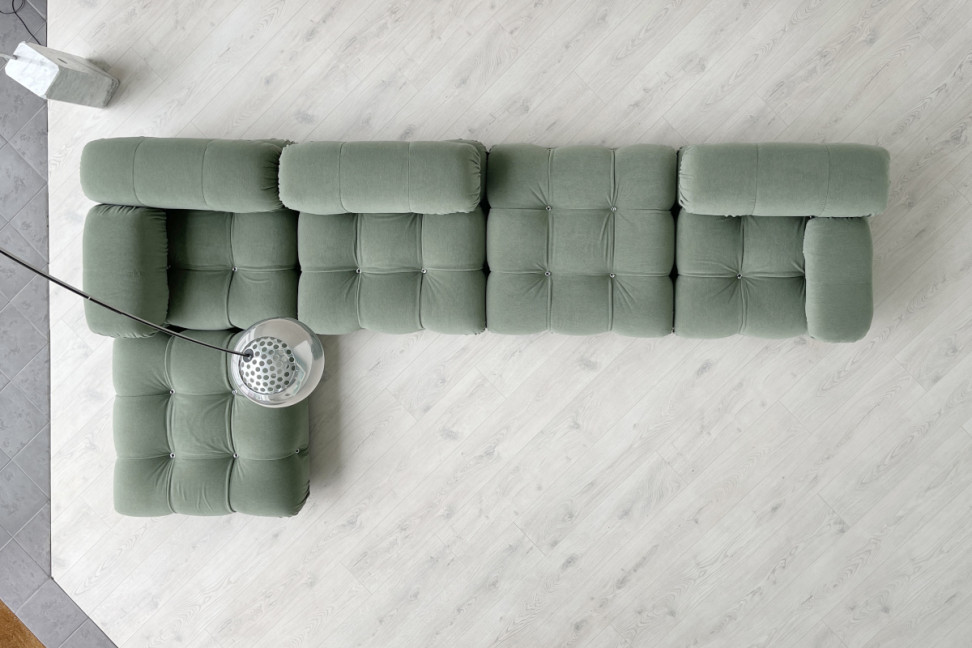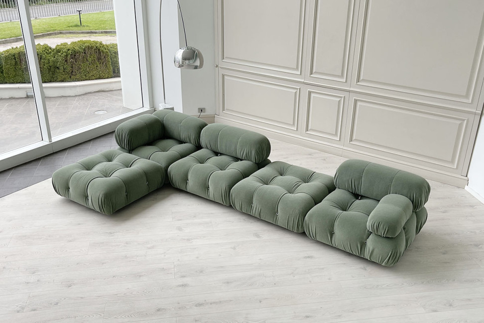 Il divano Camaleonda in Offerta Expo presso il nostro showroom si distingue per il suo rivestimento in tessuto di colore verde, che conferisce un tocco di freschezza e vivacità all'ambiente circostante. La composizione del divano include un elemento angolare sinistro, un elemento centrale, due pouf quadrati e un elemento terminale destro. Questa configurazione specifica offre una disposizione armoniosa e funzionale, consentendo di creare un'area accogliente e versatile nel tuo spazio abitativo.