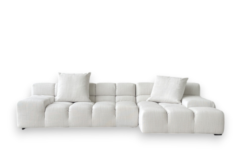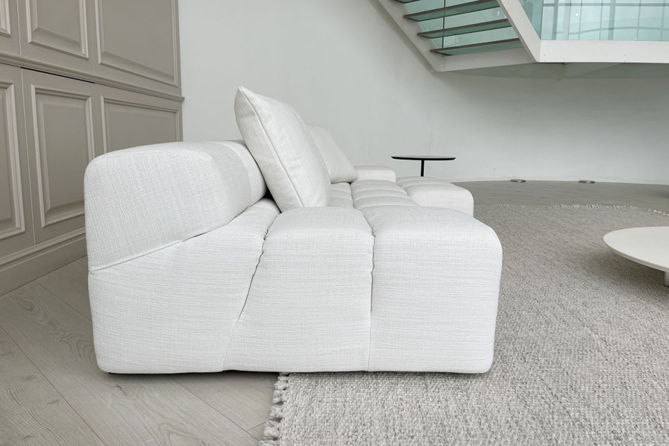 Il Divano Tufty-Time in offerta expo nel nostro showroom è composto da un elemento terminale sinistro con bracciolo basso e un elemento terminale destro con bracciolo basso e chaise longue. Entrambi i moduli sono rivestiti in tessuto color bianco. I due cuscini decorativi inclusi sono rivestiti dello stesso tessuto e tonalità del divano. La combinazione di braccioli bassi e chaise longue eleva l'esperienza di seduta a livelli di comodità superiori.